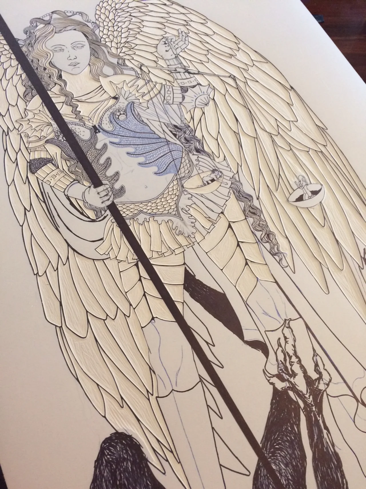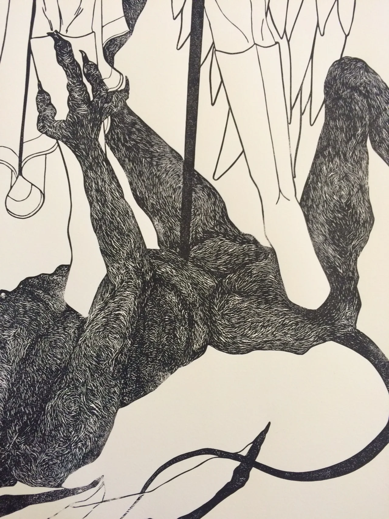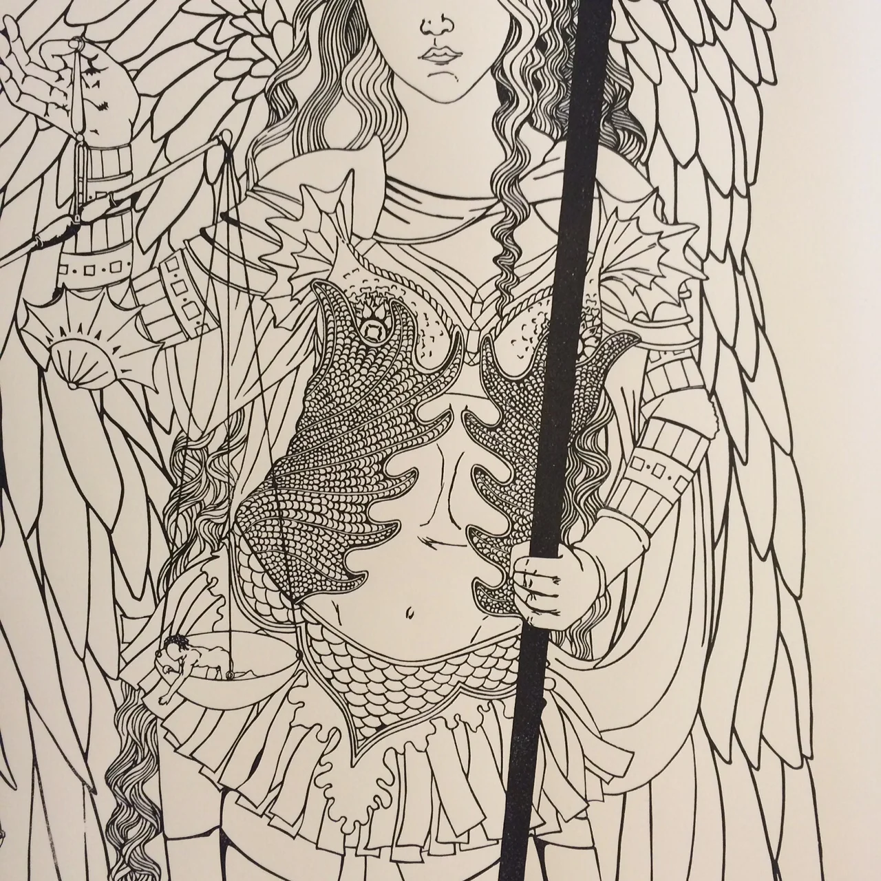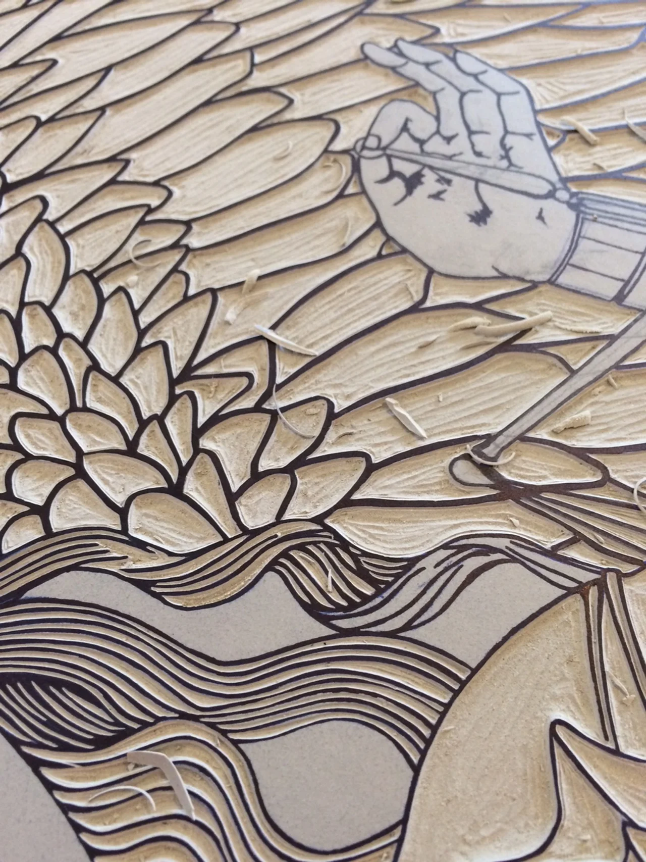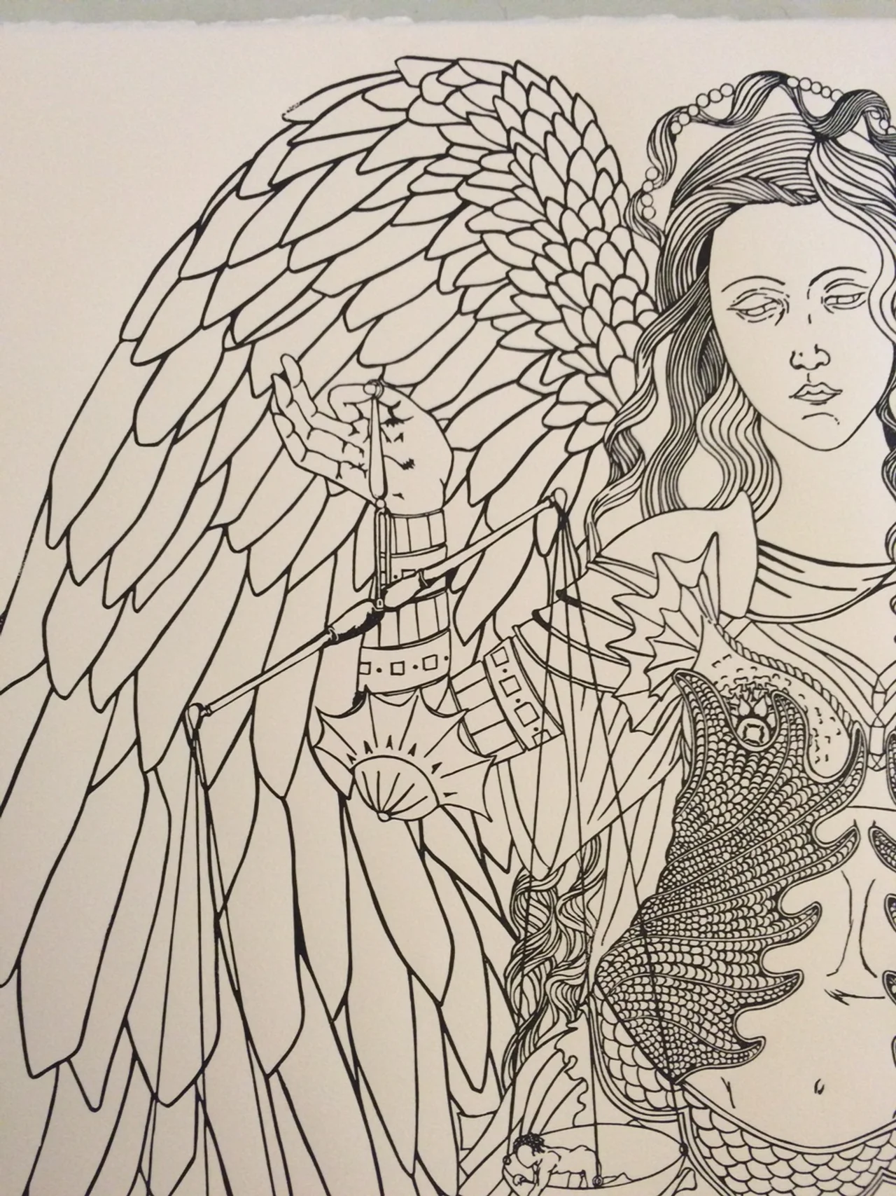 Ok. So this one's big. Lino measures: 1160mm x 700mm (46" x 28") I've accepted that large scale is where it's at for me. This piece is inspired (pretty obviously I would assume) by Archangel Michael, with a twist. I've always had a fascination with religious art; the drama and opulence. Did I mention colour?! I'll be hand colouring these prints.