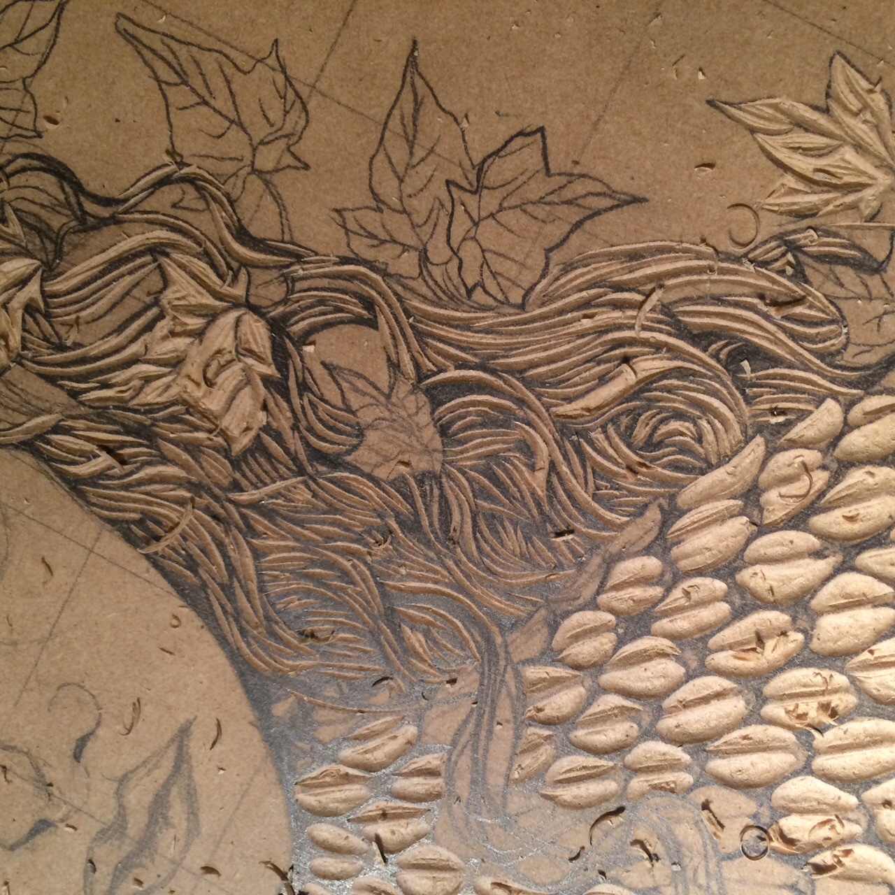 This week I finally got a chance to take a proof print of this rather large lino. It's been hard going (especially being that I hand rubbed this), but I'm quite happy with the results so far. Inevitably, there were a few minor bits I missed, but overall I think it's ready for a print run. Now, it's time to start playing with colour.