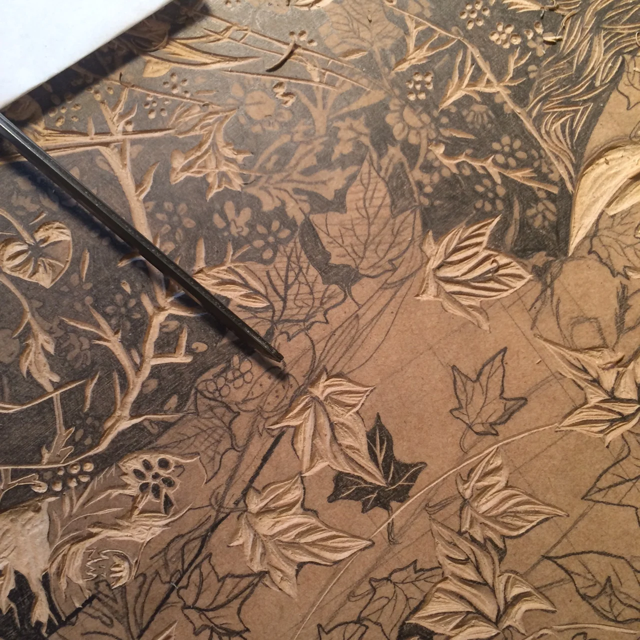 Inking up. AKA the fun bit. Actually I love the process and think that's what really won me over with print making. That aside I thought it's time to see what I've achieved so far. I love that you still don't know exactly what you're going to get. There's something special that happens that you can't account for and you're never quite sure what that will be. You also don't know if you will like it. So the idea is to get a proof print to then work back in to the board with white pencil once it's blacked in. I want to live with this proof for a while and see what it calls for( like a face) and what it doesn't. To be continued...
